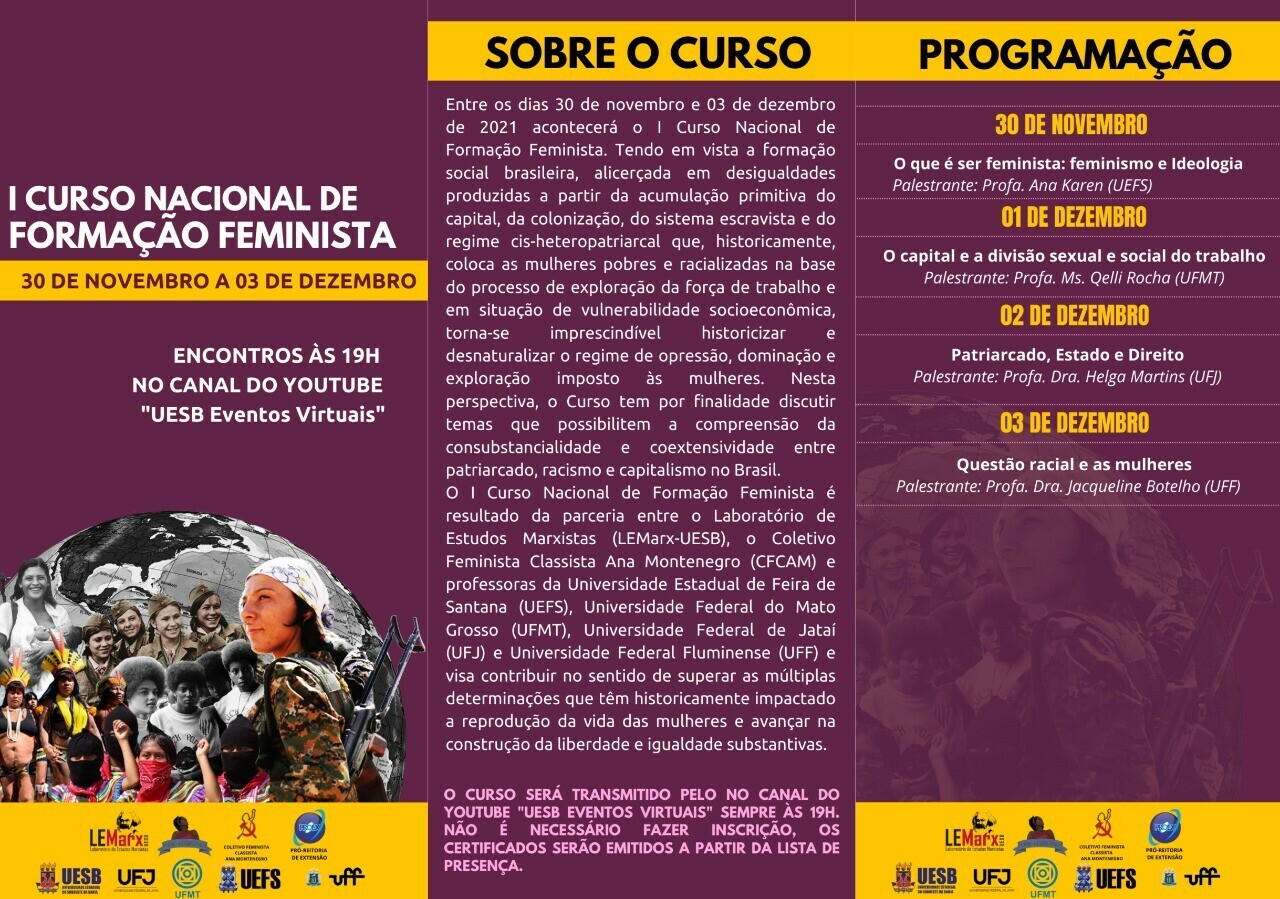 O I Curso Nacional de Formação Feminista é resultado da parceria entre o Laboratório de Estudos Marxistas (LEMarx-UESB), o Coletivo Feminista Classista Ana Montenegro (CFCAM) e professoras da Universidade Estadual de Feira de Santana (UEFS), Universidade Federal do Mato Grosso (UFMT), Universidade Federal de Jataí (UFJ) e Universidade Federal Fluminense (UFF). Esta ação visa contribuir no sentido de superar as múltiplas determinações que têm historicamente impactado a reprodução da vida das mulheres e avançar na construção da liberdade e igualdade substantivas.